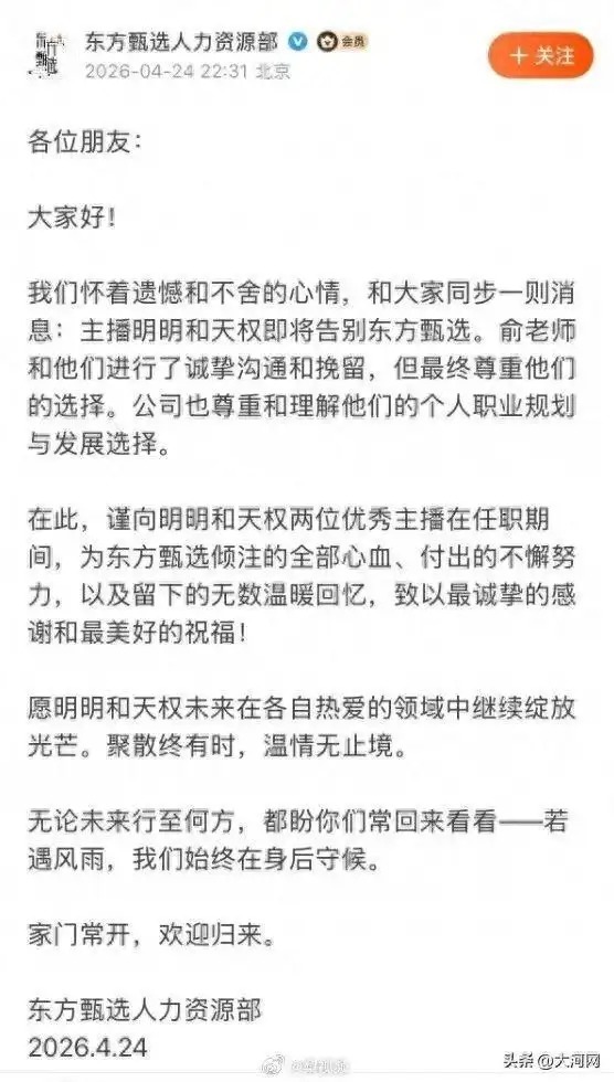 4月24日,东方甄选人力资源部在社区发文:“我们怀着遗憾和不舍的心情,和大家同步一则消息:主播明明和天权即将告别东方甄选。俞老师和他们进行了诚挚沟通和挽留,但最终尊重他们的选择。公司也尊重和理解他们的个人职业规划与发展选择。