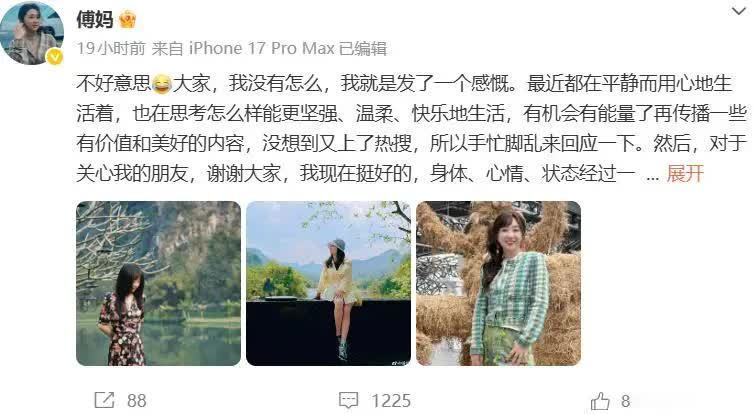 舆论发酵不过数小时,傅首尔本人火速下场回应。她晒出几张近照,配文语气坦然:“我没有怎么,我就是发了一个感慨。我现在挺好的,身体、心情、状态经过一段时间调整,都有改变。还没有新感情。”